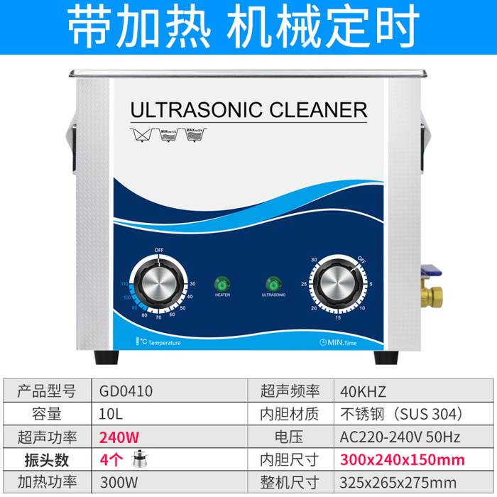 冠博仕GD0410機械帶加熱超聲波清洗機10L容量240W功率