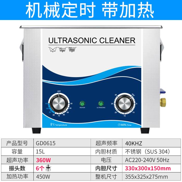 冠博仕GD0615機(jī)械帶加熱超聲波清洗機(jī)15L容量360W功率